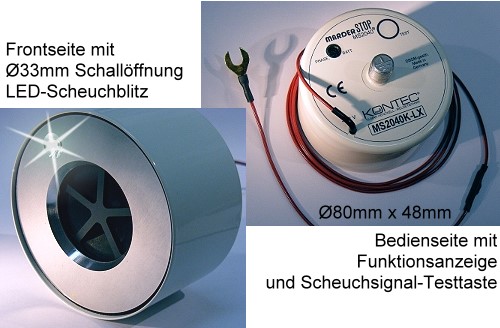 Eine ausgeklügelte Schaltungstechnik zur Erzeugung der über 6000 Warnfrequenzen des marderSTOP MS2040® sorgt für sicheren, stetigen Betrieb auch bei größeren Temperaturschwankungen oder sogar bei sinkender Bordspannung. Die Strom-Aufnahme ist ab 0,16 mA unerreicht niedrig in der Scheuchpause und belastet Ihren Akku in der meisten Zeit somit kaum; daher kann das Gerät ständig in Betrieb bleiben. Die Stromversorgung erfolgt per Montage über das Chassis (Minus) und über einen einfachen Zuleitungsdraht (Akku, Plus) mit bereits integrierter Sicherung; der Einbau ist somit einfach und kann minutenschnell durchgeführt werden. Das Gerät ist zudem verpolungssicher, spritzwassergeschützt und funkentstört. Durch Stromentnahme ausgelöste Alarmanlagen oder Ultraschall-Abstandsmelder werden nicht beeinflußt. marderSTOP MS2040® ist in allen Versionen auf optimale Schall-Leistung gezüchtet und benötigt keine Zusatz-Schallgeber. Bei den erweiterten Ausführungen können Sie zusätzlich über eine Anzeige die Scheuchphasen beobachten oder den Warnton mittels Test-Taste in den hörbaren Bereich versetzen oder sich sogar den Ladezustand Ihres Akkus anzeigen lassen. Optional ist eine Fernkontrolle/Fernbedienung des Gerätes vom Armaturenbrett aus möglich und es ist sogar u.a. als kombinierte Alarmsirene (Überfallmelder!) erhältlich! Die Anzeige der Scheuchphase ist so hell, daß deren Lichtblitze über rückseitige Licht-Reflexionen bereits auch optisch abschrecken! Neuartig — und allein von KONTEC angeboten — ist die im Bereich oder Zentrum des Schallgebers eingebaute superhelle, blitzweiß strahlende Leuchtdiode neuester Technologie, die durch ihr Aufflackern im frontalen Bereich die Scheuchwirkung auf ein Maximum treibt! Nach Einbau des Gerätes bleibt der Motorraum für Wartungsarbeiten frei zugänglich. marderSTOP MS2040® arbeitet mit der ungefährlichen Ultraschall-Methode und gibt keine Hochspannung frei.